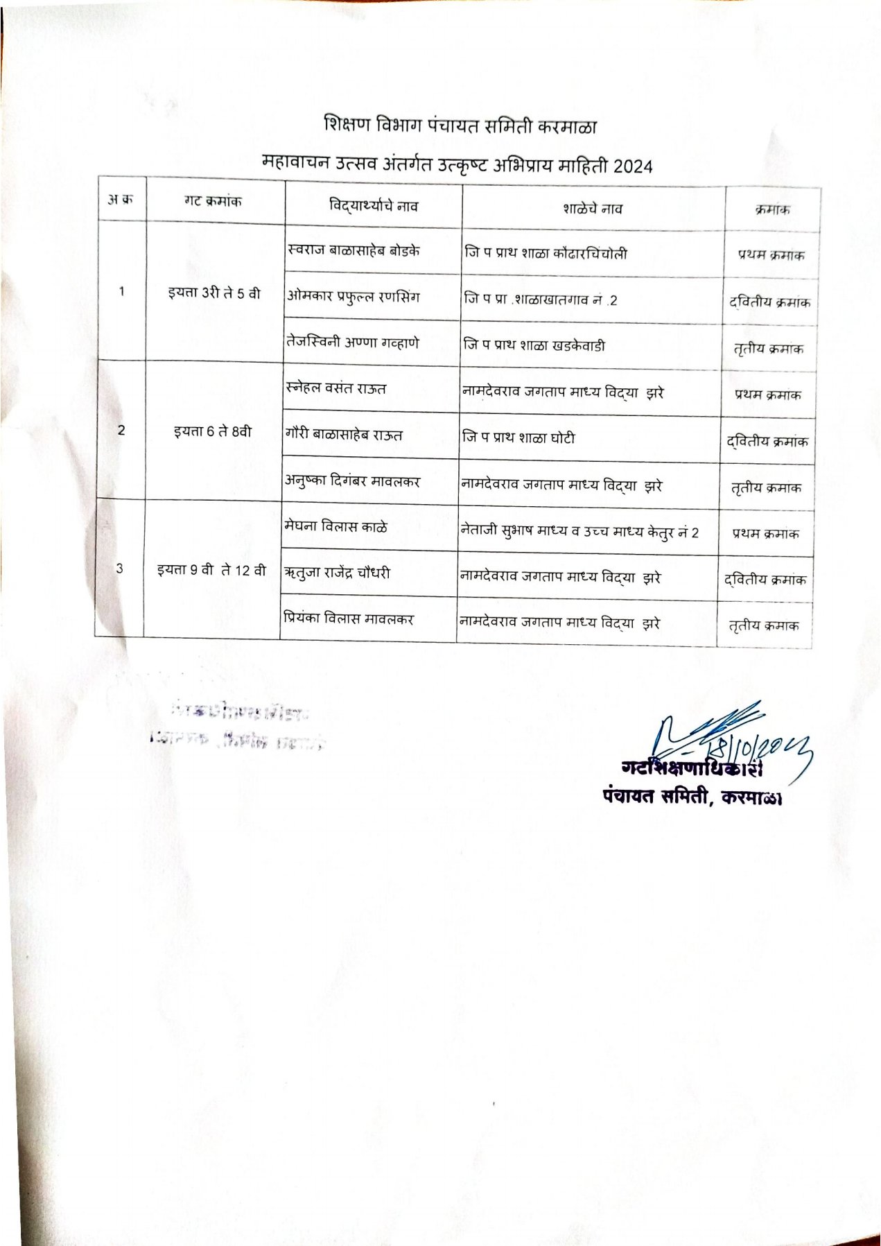 राज्यातील सर्व व्यवस्थापनाच्या शाळांसाठी राज्य शासनाने 2024 महावाचन उत्सव आयोजित केला वाचन चळवळ वाढावी वाचन व्यक्तिमत्व विकासाचे महत्त्वाचे साधन आहे वाचनामुळे ज्ञानवृद्धी होते विचार कक्षा रुंदावते यासाठी महाराष्ट्र वाचन चळवळ हा उपक्रम सर्व महाराष्ट्रभर राबवला यासाठी गटशिक्षणाधिकारी पंचायत समिती करमाळा कार्यालयाने स्पर्धा आयोजित केली होती यामध्ये तिसरी ते पाचवी गटामध्ये १ )स्वराज बाळासाहेब बोडके जि प शाळा कोंढार चिंचोली 2 )ओंकार प्रफुल्ल रणसिंग जि प शाळा खातगाव 3 )तेजस्विनी आण्णा गव्हाणे जि प शाळा खडकेवाडी यांचा अनुक्रमे प्रथम तीन क्रमांक आला सहावी ते आठवी गटातून १)स्नेहल वसंत राऊत नामदेवराव जगताप माध्यमिक विद्यालय झरे 2)गौरी बाळासाहेब राऊत जि प शाळा घोटी ३)अनुष्का दिगंबर मावलकर नामदेवराव जगताप माध्यमिक विद्यालय झरे या विद्यार्थिनींचा अनुक्रमे प्रथम तीन क्रमांक आला तसेच नववी ते बारावी गटामधून १)मेघना विलास काळे नेताजी सुभाषचंद्र विद्यालय केतुर 2)ऋतुजा राजेंद्र चौधरी नामदेवराव जगताप माध्यमिक विद्यालय झरे ३)प्रियंका विलास माव लकर नामदेवराव जगताप माध्यमिक विद्यालय या विद्यार्थ्यांचा अनुक्रमे प्रथम तीन क्रमांक आले यशस्वी विद्यार्थ्यांचे मार्गदर्शक शिक्षकांचे गटशिक्षणाधिकारी जयवंत नलवडे साहेब तसेच विस्तार अधिकारी टकले साहेब यांनी अभिनंदन केले