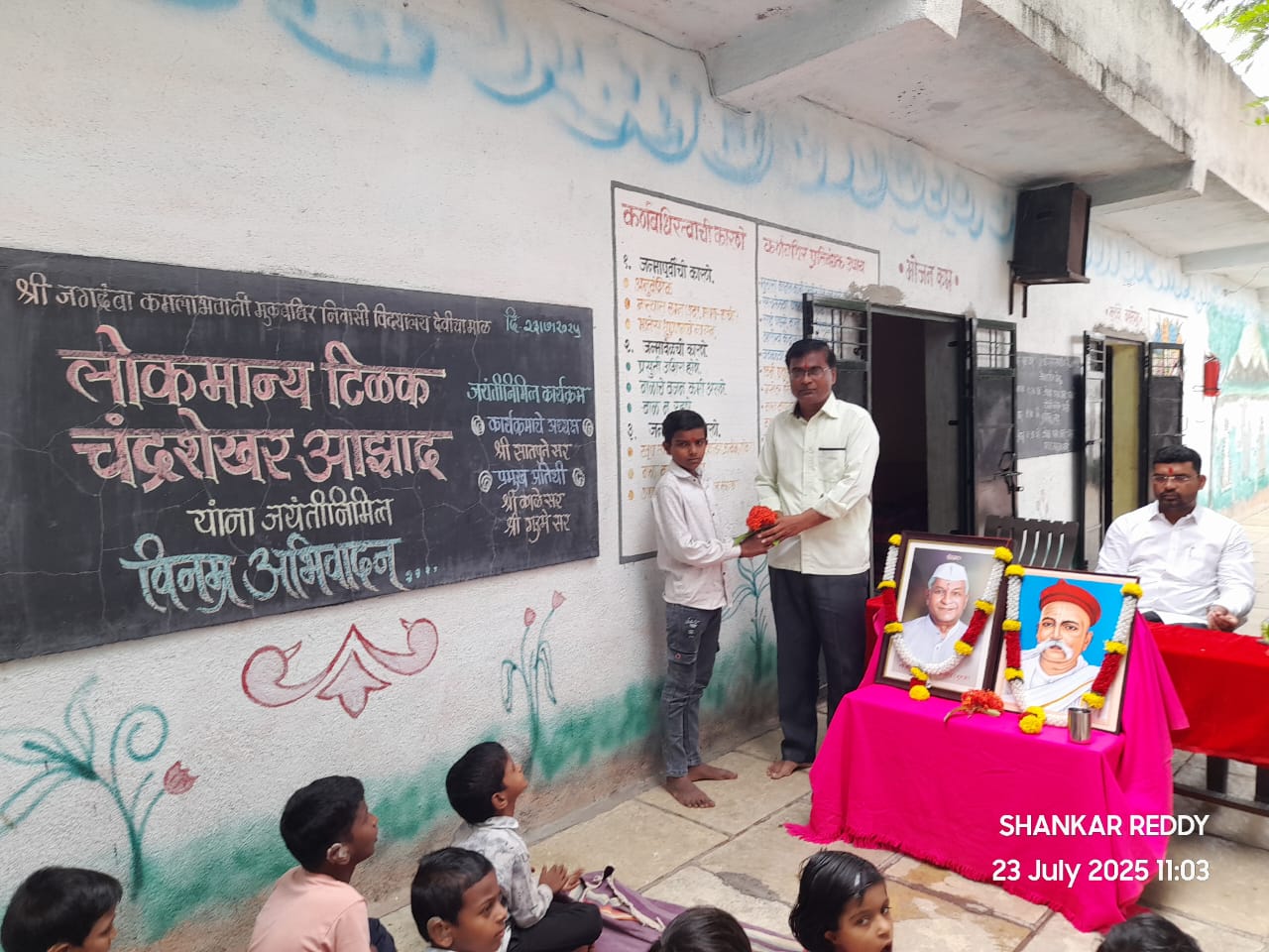 काळे सर व कला शिक्षक गुरमे सर हे होते. यावेळी गणेश सातपुते सर यांनी लोकमान्य टिळक त्यांच्या विषयी आपले मनोगतातून त्यांच्या कार्याचा गौरव केला व त्यांच्या कार्याची माहिती दिली व चंद्र शेखर आझाद यांच्या जयंती निमित्त