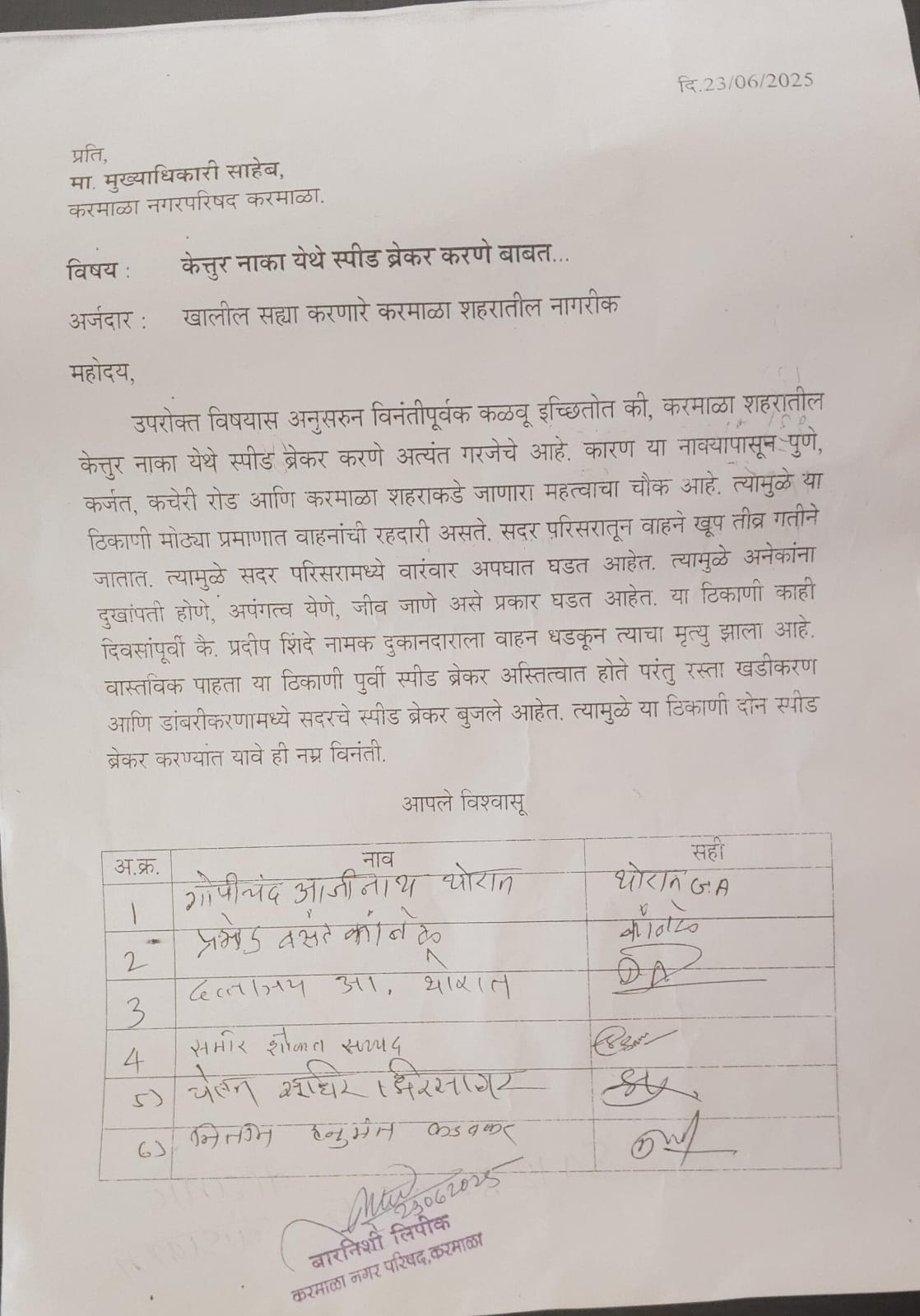 याबाबतचे अर्ज मुख्याधिकारी करमाळा यांना देण्यात आले आहे. अर्जात असे लिहिले आहे की, करमाळा शहरातील केत्तुर नाका येथे गतिरोधक करणे अत्यंत गरजेचे आहे. कारण या नाक्यापासून पुणे, कर्जत, कचेरी रोड आणि करमाळा शहराकडे जाणारा महत्वाचा चौक आहे. त्यामुळे या ठिकाणी मोठ्या प्रमाणात वाहनांची रहदारी असते. सदर परिसरातून वाहने खूप तीव्र गतीने जातात. त्यामुळे सदर परिसरामध्ये वारंवार अपघात घडत आहेत. त्यामुळे अनेकांना दुखांपती होणे, अपंगत्व येणे, जीव जाणे असे प्रकार घडत आहेत. या ठिकाणी काही दिवसांपूर्वी कै. प्रदीप शिंदे नामक दुकानदाराला वाहन धडकून त्याचा मृत्यु झाला आहे. वास्तविक पाहता या ठिकाणी पुर्वी गतिरोधक अस्तित्वात होते परंतु रस्ता खडीकरण आणि डांबरीकरणामध्ये सदरचे गतिरोधक बुजले आहेत. त्यामुळे या ठिकाणी गतिरोधक करण्यात यावे.