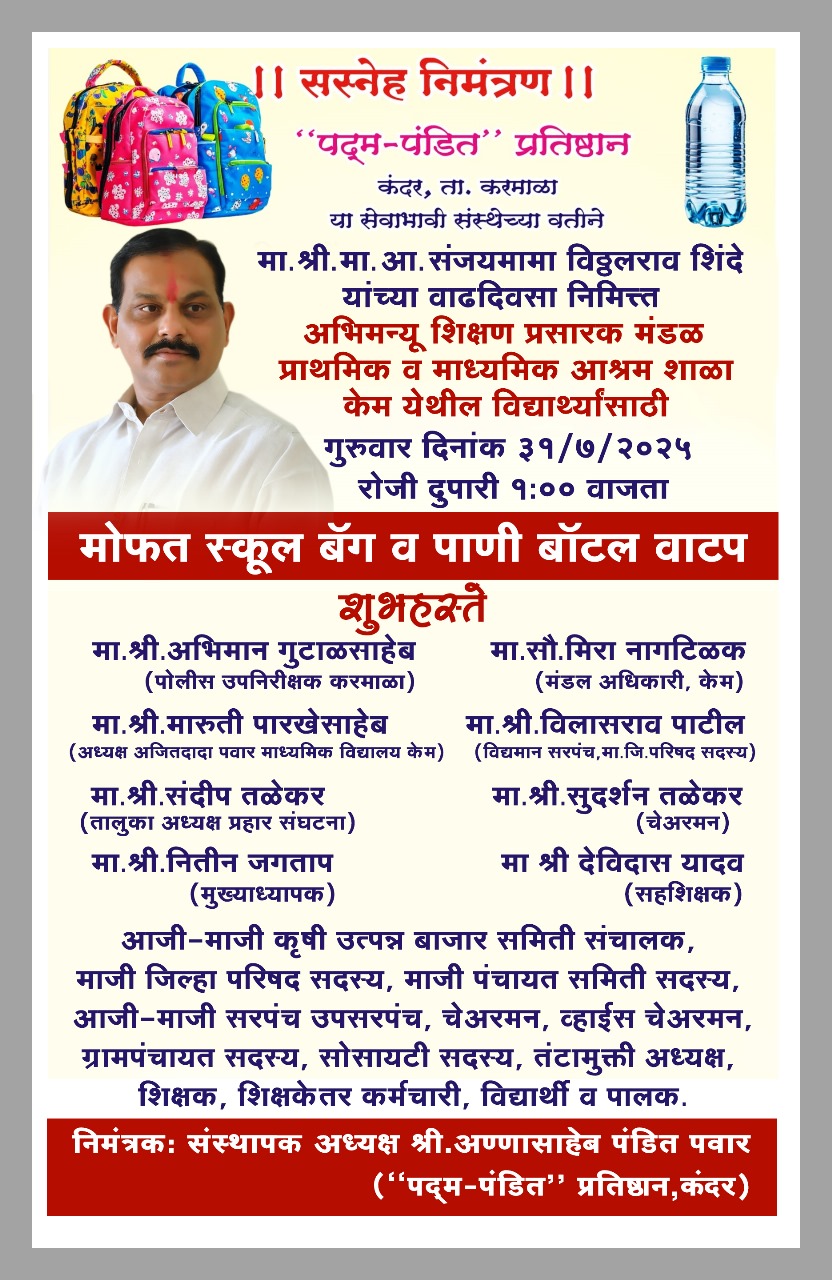 पद्म-पंडित प्रतिष्ठान या सेवाभावी संस्थेच्या वतीने संजयमामा विठ्ठलराव शिंदे यांच्या वाढदिवसानिमित्त्त अभिमन्यू शिक्षण प्रसारक मंडळ प्राथमिक व माध्यमिक आश्रम शाळा केम येथील विद्यार्थ्यांसाठी गुरुवार दिनांक ३१/७/२०२५ रोजी दुपारी १:०० वाजता मोफत स्कूल बॅग व पाणी बॉटल वाटप होणार आहे.