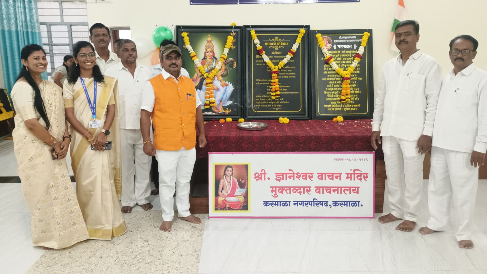 संतश्रेष्ठ श्री ज्ञानेश्वर महाराज यांच्या 750 व्या जयंतीनिमित्त तसेच 2025 हे वर्ष संतश्रेष्ठ ज्ञानेश्वर माऊलींचे सप्तशतकोत्तर सुवर्ण महोत्सवी जयंती वर्ष म्हणून संपूर्ण महाराष्ट्रात साजरे होत आहे. गोकुळाष्टमीस अर्थात आज 15 ऑगस्ट 2025 रोजी संतश्रेष्ठ ज्ञानेश्वर महाराजांची 750 वी जयंती आहे. या पार्श्वभूमीवर श्री ज्ञानेश्वर वाचन मंदिर करमाळा येथे पसायदान, भारतीय संविधान उद्देशिका आणि सरस्वती मातेच्या प्रतिमेचे पूजन करण्यात आले.