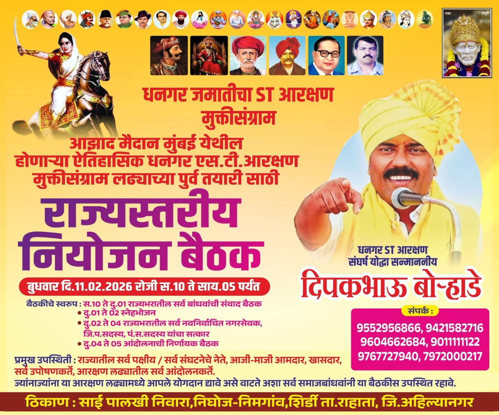 महाराष्ट्र राज्यातील धनगर समाजाला भारतीय राज्यघटनेचे शिल्पकार विश्वरत्न डॉ बाबासाहेब आंबेडकर यांनी घटनेच्या पृष्ठ क्रमांक ३६ वर समाविष्ट केलेले असताना राज्यातील तत्कालीन राज्यकर्त्यांनी धनगर समाजाला एसटी अनुसूचित जातीचे आरक्षणामुळे वंचित ठेवल्याचे पाप केलेले आहे धनगर समाज डोंगरदऱ्या, कडीकपाऱ्या मध्ये फिरून मेंढपाळ व्यवसाय करणारा समाज म्हणून ओळखला जातो या समाजाला संविधानिक न्याय मिळालेला असतानाही राज्यकर्त्यांनी मात्र धनगर समाजाला एसटी अनुसूचित आरक्षणापासून वंचित ठेवलेले आहे गेल्या ६५ वर्षापासून राज्यातील धनगर समाज आरक्षणाच्या आपल्या हक्काच्या मागणीसाठी संघर्ष करत आहे परंतु आता ही शेवटची लढाई असून संघर्ष योद्धा दीपक भाऊ बोराडे यांच्या माध्यमातून एक स्वाभिमानी नेतृत्व मिळालेले आहे त्यामुळे समाजाने आता त्यांच्या नेतृत्वात काम केले पाहिजे धनगर एसटी आरक्षण तेव्हा शक्य आहे सर्वजण एकत्र येऊन रस्त्यावरची आणि न्यायालयातील एकत्र लढाई लढू! अन्यथा सरकार कायमच हातावर तुरी देणार हे नक्की आहे म्हणून पुढील दिशा ठरविण्यासाठी त्याच्या अनुषंगाने धनगर जमातीच्या एसटी अनुसूचीत जमातीच्या आरक्षणाची पुढील दिशा ठरवण्यासाठी दिनांक ११ फेब्रुवारी बुधवार रोजी अहिल्यानगर जिल्ह्यातील शिर्डी येथे धनगर समाजाच्या आरक्षणासाठी एल्गार बैठकीचे आयोजन करण्यात आले असून या बैठकीला राज्यातील धनगर समाज बांधवांनी हजारोंच्या संख्येने उपस्थित राहावे असे आवाहन सामाजिक कार्यकर्त्या माजी सरपंच सौ लक्ष्मी संजय सरवदे यांनी केले आहे.