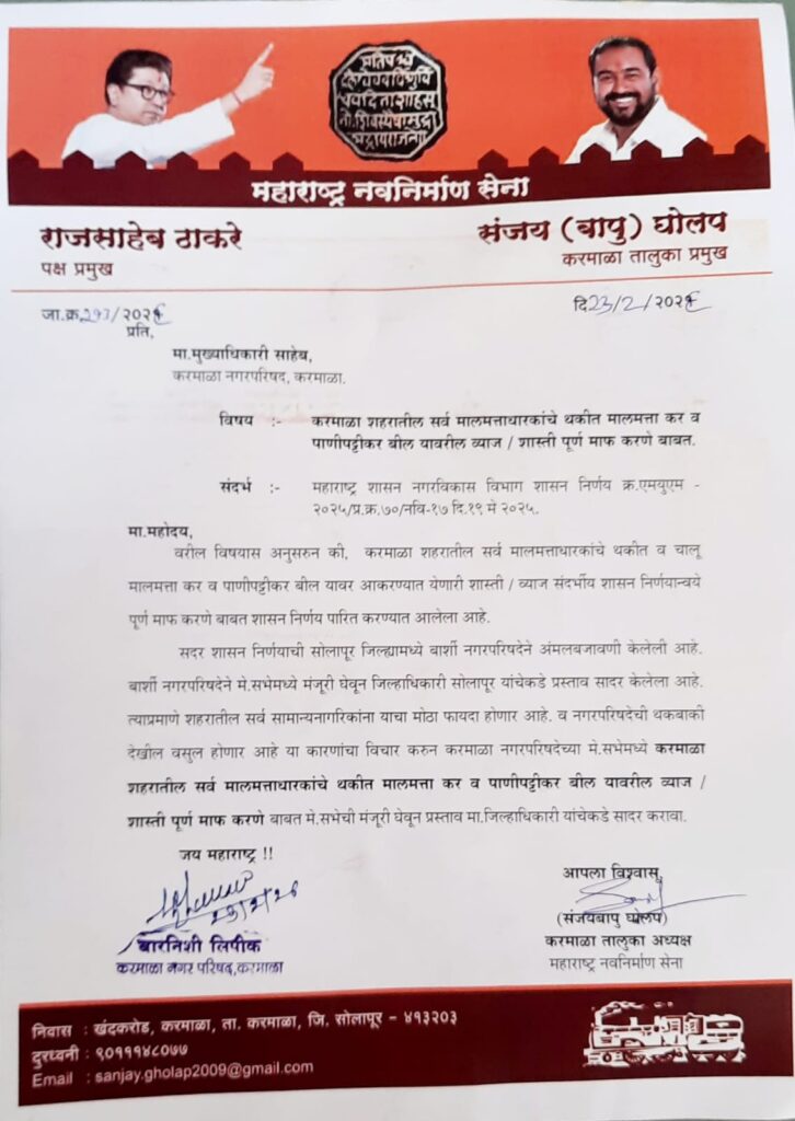 करमाळा शहरातील सर्व मालमत्ताधारकांच्या थकीत तसेच चालू मालमत्ता कर व पाणीपट्टीकर बिलावरील व्याज आणि शास्ती (दंड) पूर्णपणे माफ करण्याची मागणी थकीत तसेच चालू मालमत्ता कर व पाणीपट्टीकर बिलावरील व्याज आणि शास्ती (दंड) पूर्णपणे माफ करण्याची मागणी महाराष्ट्र नवनिर्माण सेनेचे अध्यक्ष संजय बापु घोलप यांनी केली आहे. याबाबत मुख्याधिकारी करमाळा नगरपरिषद यांना सविस्तर निवेदन सादर करण्यात आले.