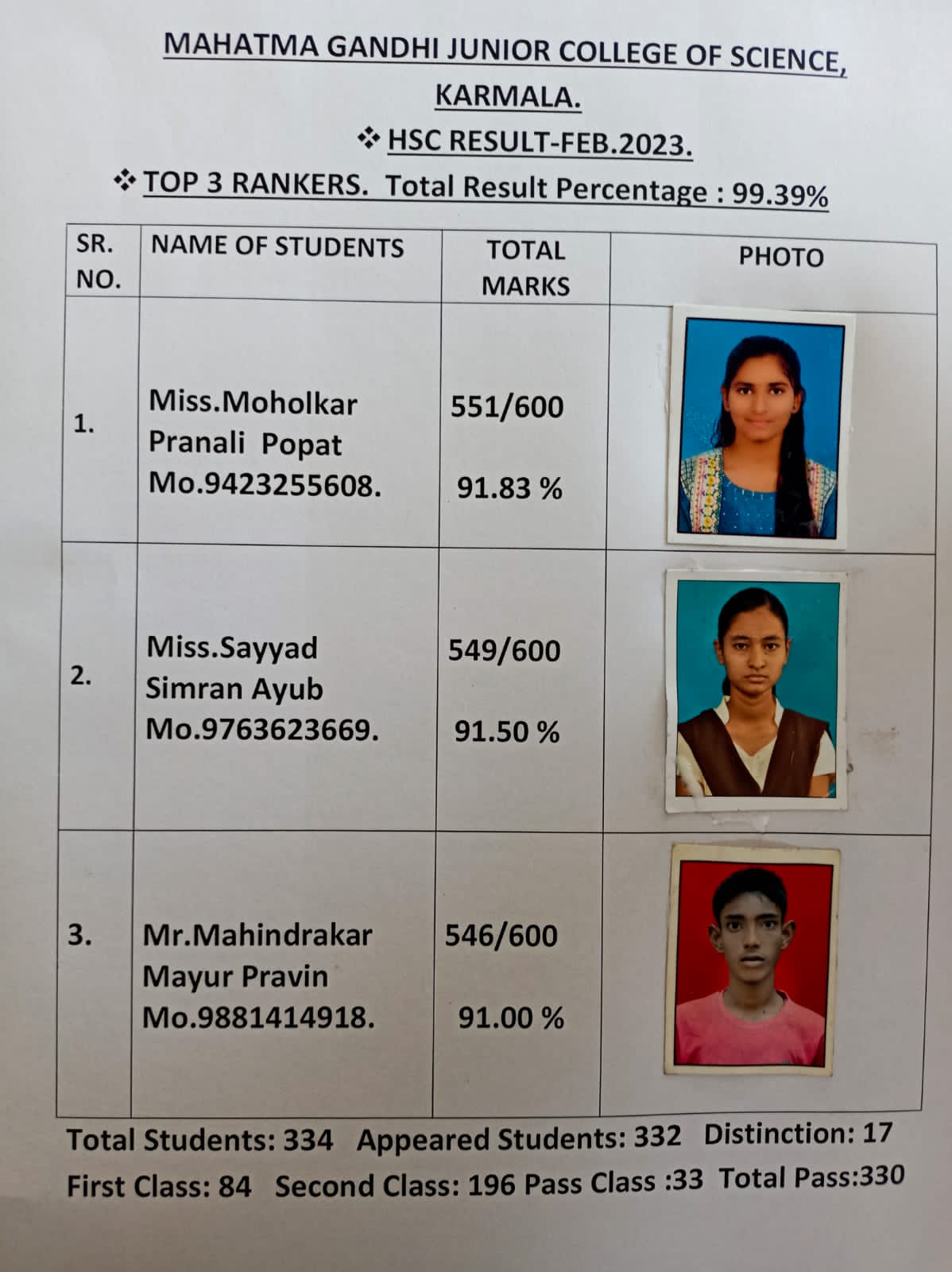म.गांधी ज्युनियर कॉलेजचा इ .१२ वी विज्ञान शाखेचा सर्वाधिक ९९.३९% निकाल