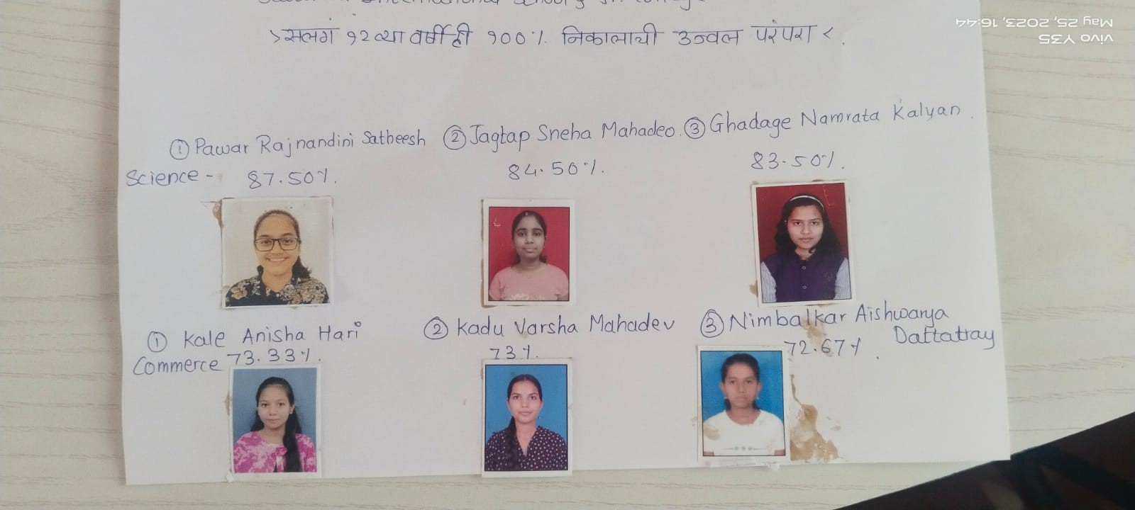 इयत्ता बारावी सायन्स मध्ये प्रथम आलेल्या विद्यार्थ्यांची नावे – 1. राजनंदिनी सतीश पवार 87.05, 2. स्नेहा महादेव जगताप 84.50, 3. नम्रता कल्याण घाडगे 83.50.