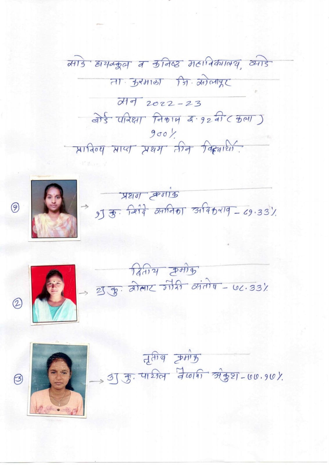 साडे हायस्कुल व कनिष्ठ महाविद्यालय ता.करमाळा जि. सोलापूर येथील बोर्ड परीक्षा निकाल इ.१२ वी.(कला) – १००% लागला. प्राविण्य प्राप्त प्रथम तीन विद्यार्थांची नावे खालीलप्रमाणे