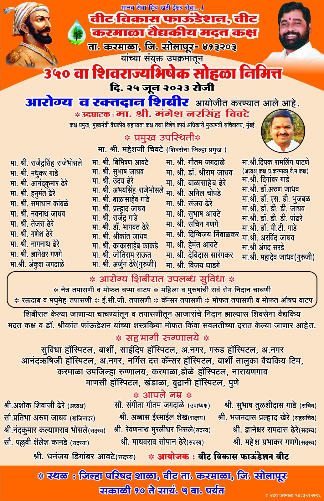 शिवराज्याभिषेक दिनानिमित्त वीट तालुका करमाळा येथे उद्या रविवार 25 जून रोजी सकाळी नऊ ते सायंकाळी पाच वाजेपर्यंत आरोग्य शिबिराचे आयोजन करण्यात आले आहे. या शिबिराचे उद्घाटन मुख्यमंत्री कार्यालयाचे विशेष कार्य अधिकारी मंगेश चिवटे यांच्या हस्ते होणार आहे.