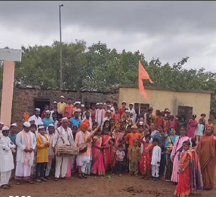 आला. तसेच शालेय विद्यार्थ्यांनी विठ्ठल रुक्मिणी, मुक्ताई, तुकाराम, एकनाथ, जनाबाई डोक्यावर तुळशी वृंदावन गळ्यात माळा विविध संतांची वेशभूषा करून गावात दिंडी काढण्यात आली.