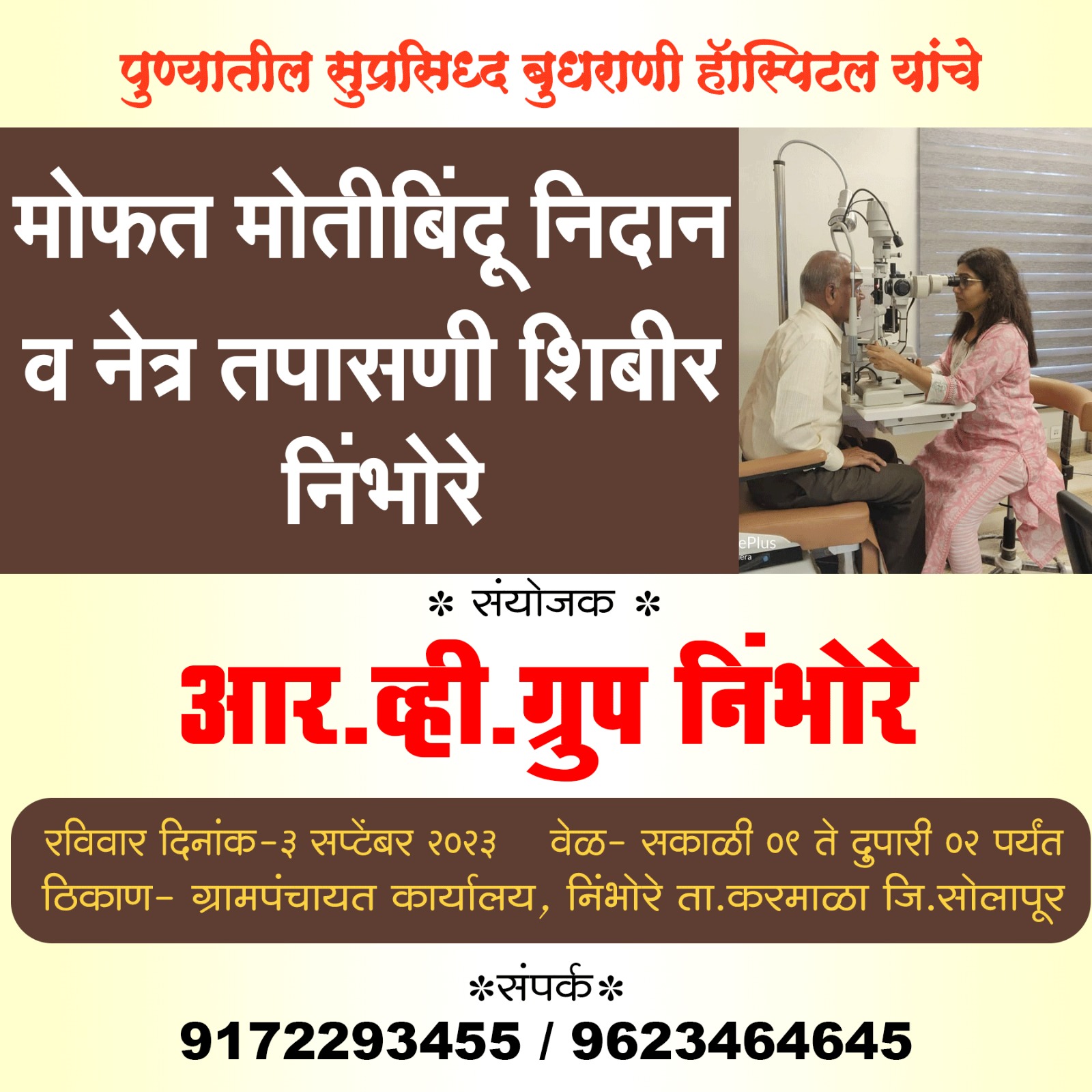 निंभोरे येथे रविवार दि. ३ सप्टेंबर २०२३ रोजी आर. व्ही. ग्रुप, निंभोरे यांचे वतीने मोफत मोतीबिंदू निदान व नेत्र तपासणी