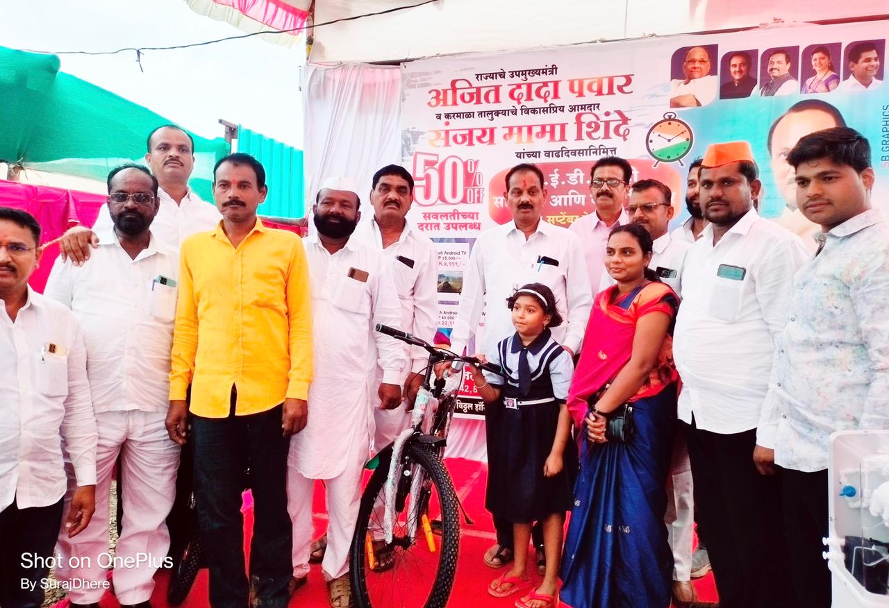 करमाळा येथे राज्याचे उपमुख्यमंत्री अजितदादा पवार व करमाळा तालुक्याचे आमदार संजयमामा शिंदे यांच्या वाढदिवसानिमित्य ५०% सवलतीच्या दरात एल.ई.डी. टिव्ही, सायकल आणि वॅाटर फिल्टर वाटप या कार्यक्रमाचे उद्घाटन आमदार संजयमामा शिंदे यांच्या हस्ते करण्यात आले.