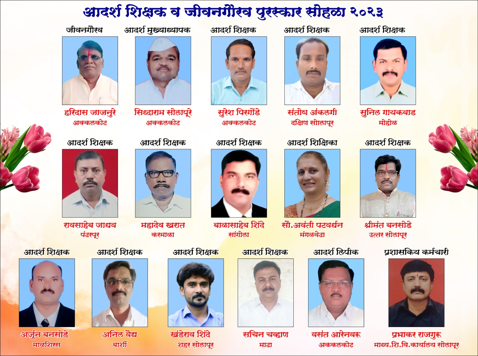 हरिदास जाजनुरे, आदर्श मुख्याध्यापक सिद्धाराम सोलापूरे, आदर्श शिक्षक सुरेश पिरगोंडे, सचिन चव्हाण, संतोष अंकलगी, सुनील गायकवाड, रावसाहेब जाधव, महादेव खरात, बाळासाहेब शिंदे, अवंती पटवर्धन, श्रीमंत बनसोडे, अर्जुन बनसोडे, अनिल वैद्य, खंडेराव शिंदे, आदर्श लिपिक वसंत अरेनवरु, प्रभाकर राजगुरू.