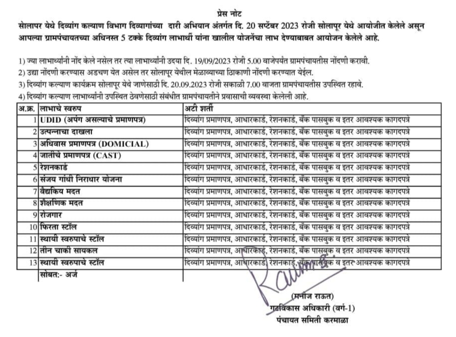 आपल्या ग्रामपंचायतच्या अधिनस्त 5% दिव्यांग लाभार्थी यांना खालील योजनेचा लाभ देण्याबाबत आयोजन केलेले आहे. ज्या लाभार्थ्यांनी नोंद केले नसेल तर त्या लाभार्थ्यांनी उद्या दि. 19/9/2023 रोजी 5 वाजेपर्यंत ग्रामपंचायतीस नोंद करावी. उद्या नोंदणी करण्यास अडचण असेल तर सोलापूर येथील मेळाव्याच्या ठिकाणी नोंदणी करण्यात येईल. दिव्यांग कल्याण कार्यक्रम सोलापूर येथे जाण्यासाठी 20/09/2023 रोजी सकाळी 7 वाजता ग्रामपंचायतीस उपस्थित राहावे. दिव्यांग कल्याण लाभार्थ्यांनी उपस्थित ठेवण्यासाठी संबंधित ग्रामपंचायतीने त्याची व्यवस्था केलेली आहे. अशी माहिती गटविकास अधिकारी मनोज राऊत यांनी दिलेली आहे.