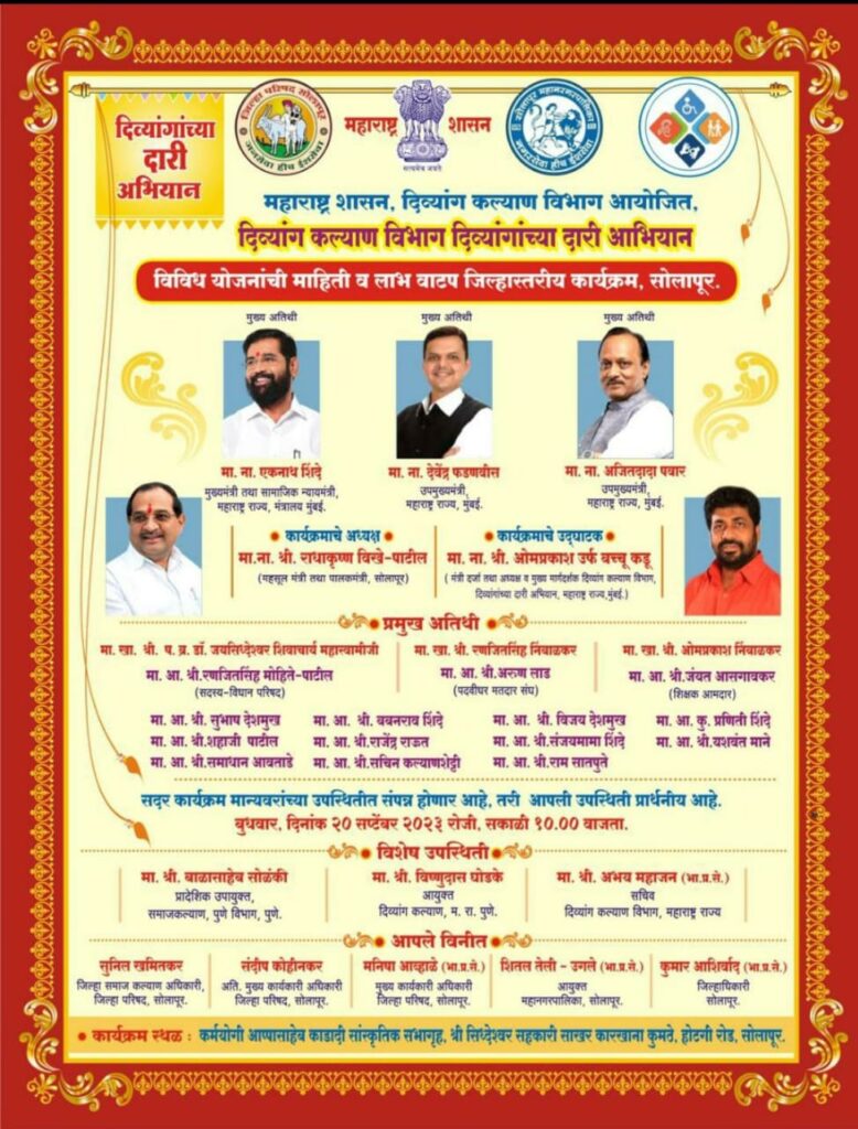 सोलापूर येथे दिव्यांग कल्याण विभाग दिव्यांगांच्या दारी अभियान अंतर्गत दि. 20 सप्टेंबर 2023 रोजी सोलापूर येथे आयोजित केलेली आहे अशी माहिती गटविकास अधिकारी मनोज राऊत यांनी दिलेली आहे.