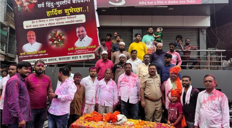 करमाळा मुस्लिम समाजाच्या वतीने ईद ए मिलाद व अनंत चतुर्दशी च्या निमित्ताने श्री गणेश विसर्जन मिरवणूकी निमित्त सुभाष चौक येथे श्री देवीचा माळ येथील राजे रावरंभा तरुण मंडळाच्या श्री गणरायाच्या मिरवणूकीचे स्वागत फुलांची पुष्पवृष्टी करुन करण्यात आली असुन सर्व गणेश भक्ताना ईद निमित्त शेरणी प्रसादाचे वाटप करण्यात आले.